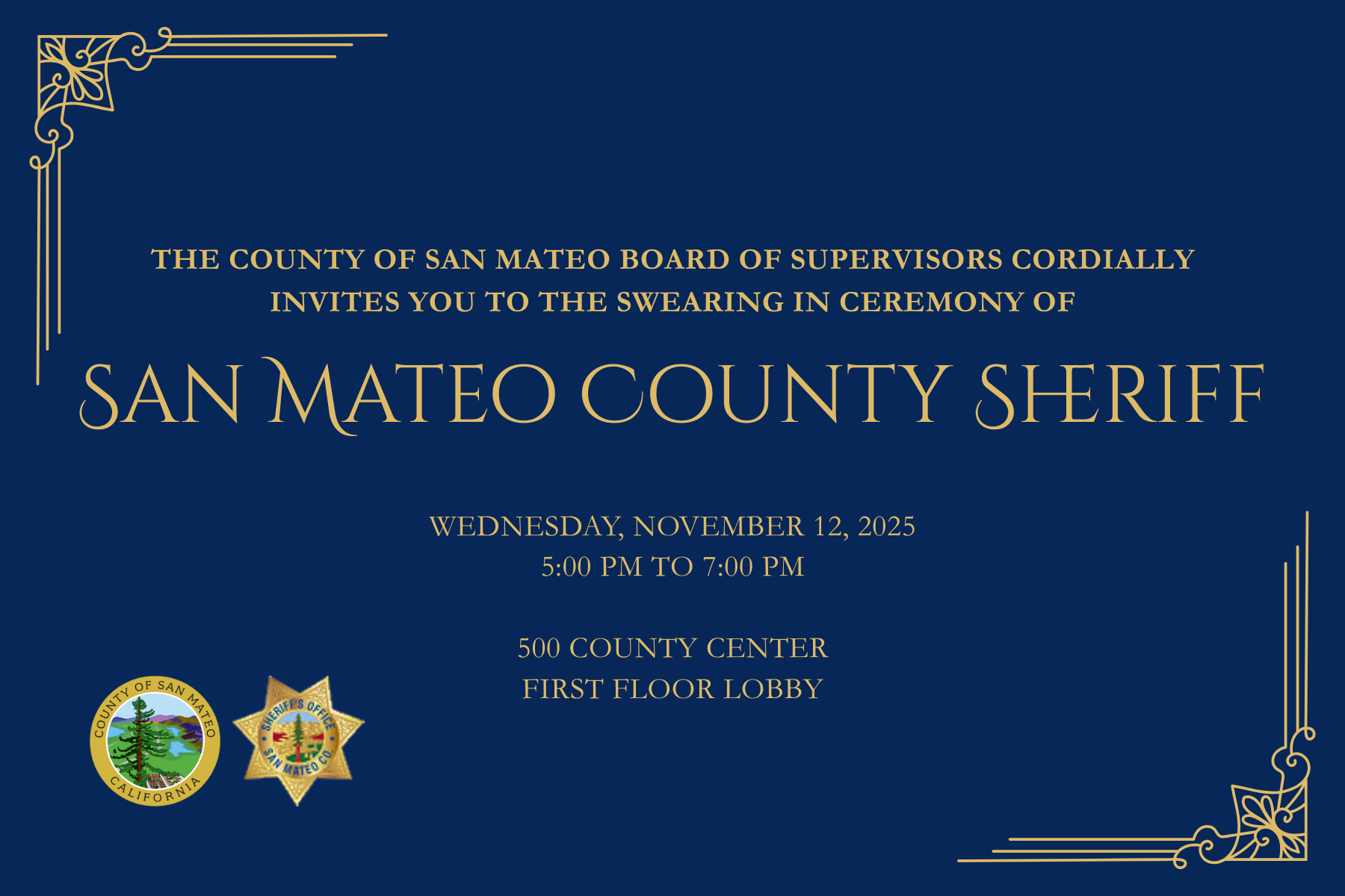 The San Mateo County Board of Supervisors cordially invites you to attend the Swearing-In Ceremony for the County Sheriff. Parking is available in the Government Center Parking Structure at 440 Middlefield Road.