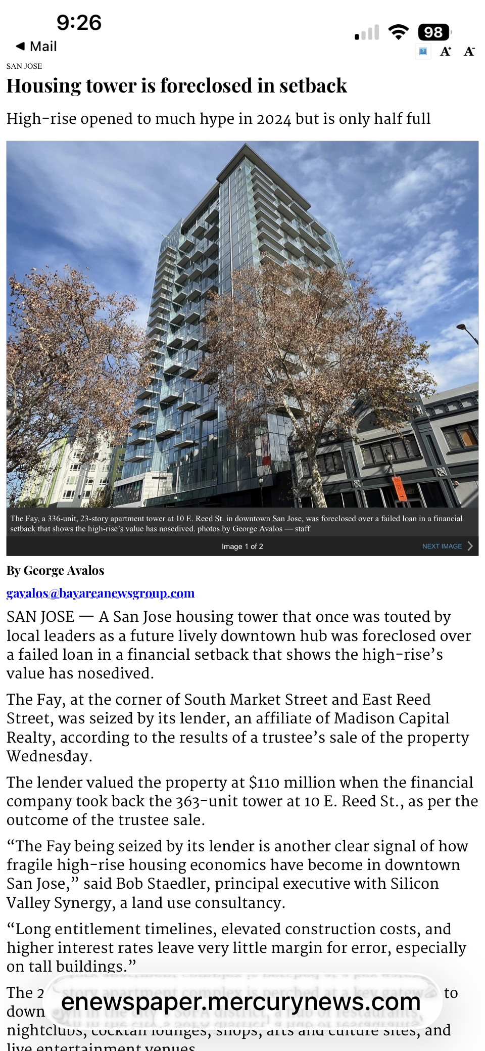 See attached Mercury news article QUOTED: