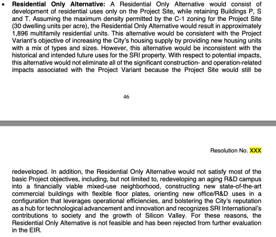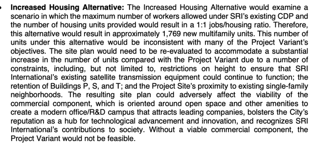 The City needs housing. The region needs housing. The State of California is requiring that we approve housing projects. Since SRI filed its application to redevelop its 62 acre site the office market has lost its appeal to commercial investors. Also Sacramento has come down hard on California cities that have continued to resist higher density housing developments. There is a 32% office vacancy in Menlo Park. Long standing commercial developers (i.e. David Bohannon) are proposing residential rather than office. Obviously the path ahead is clear. SRI parcel is an opportunity that cannot slip away..